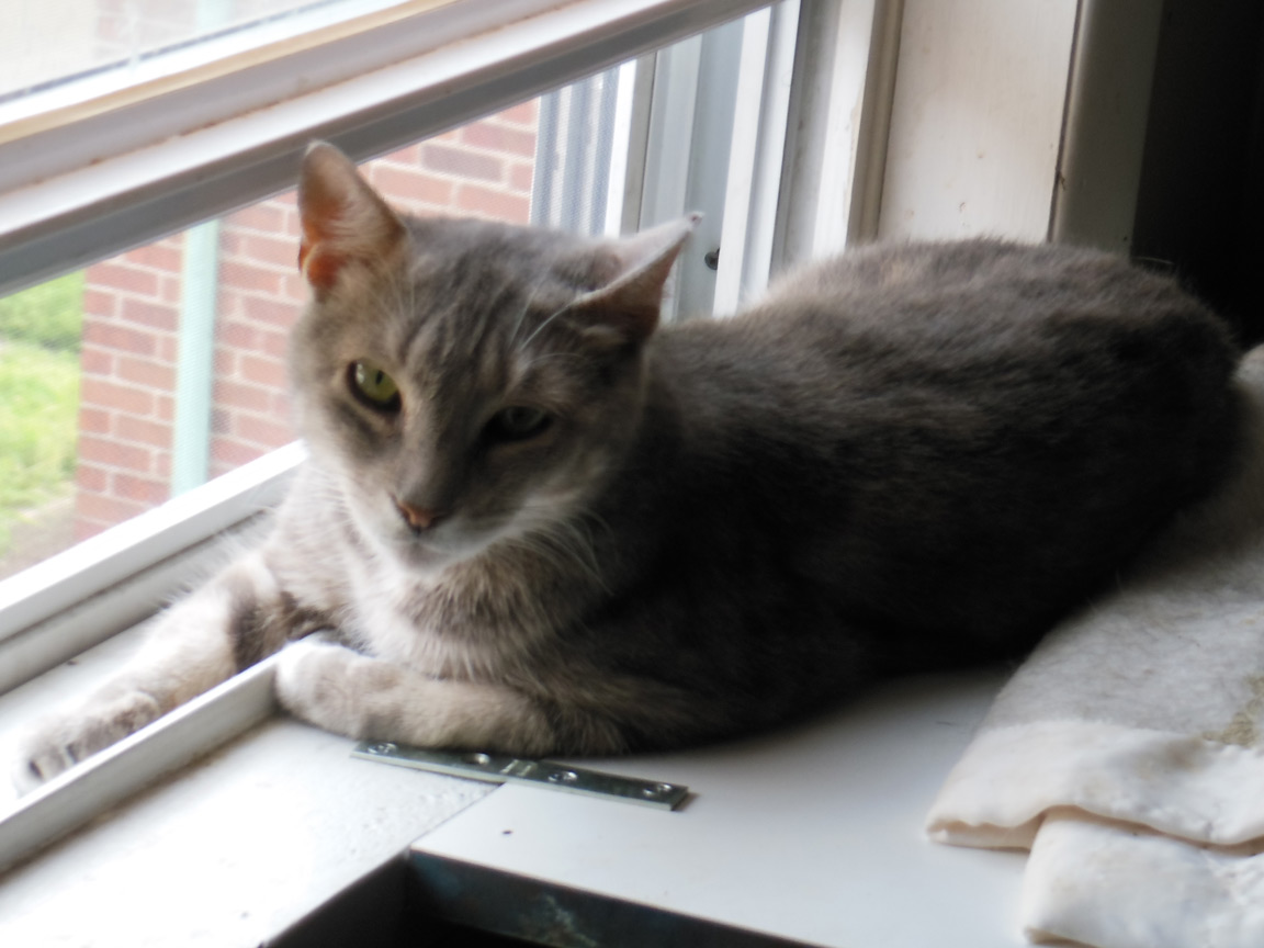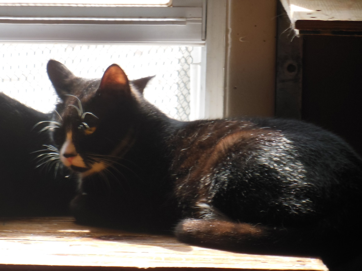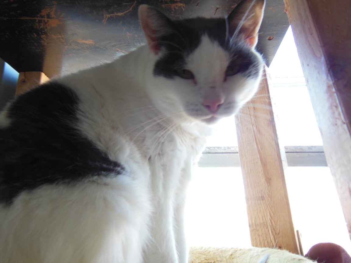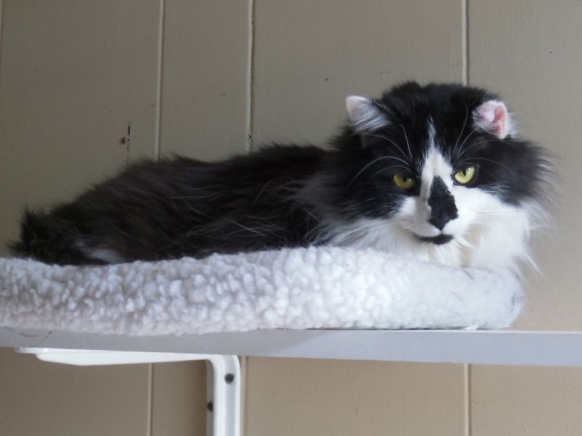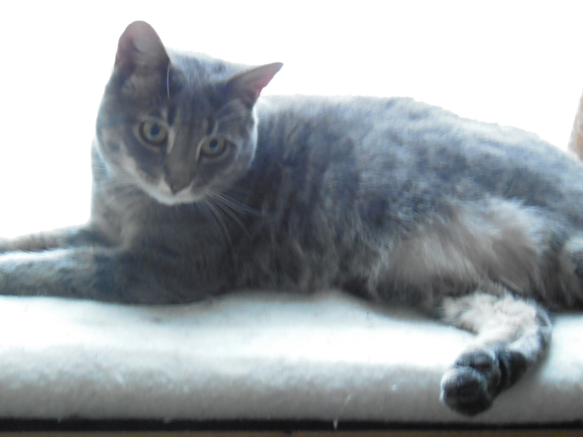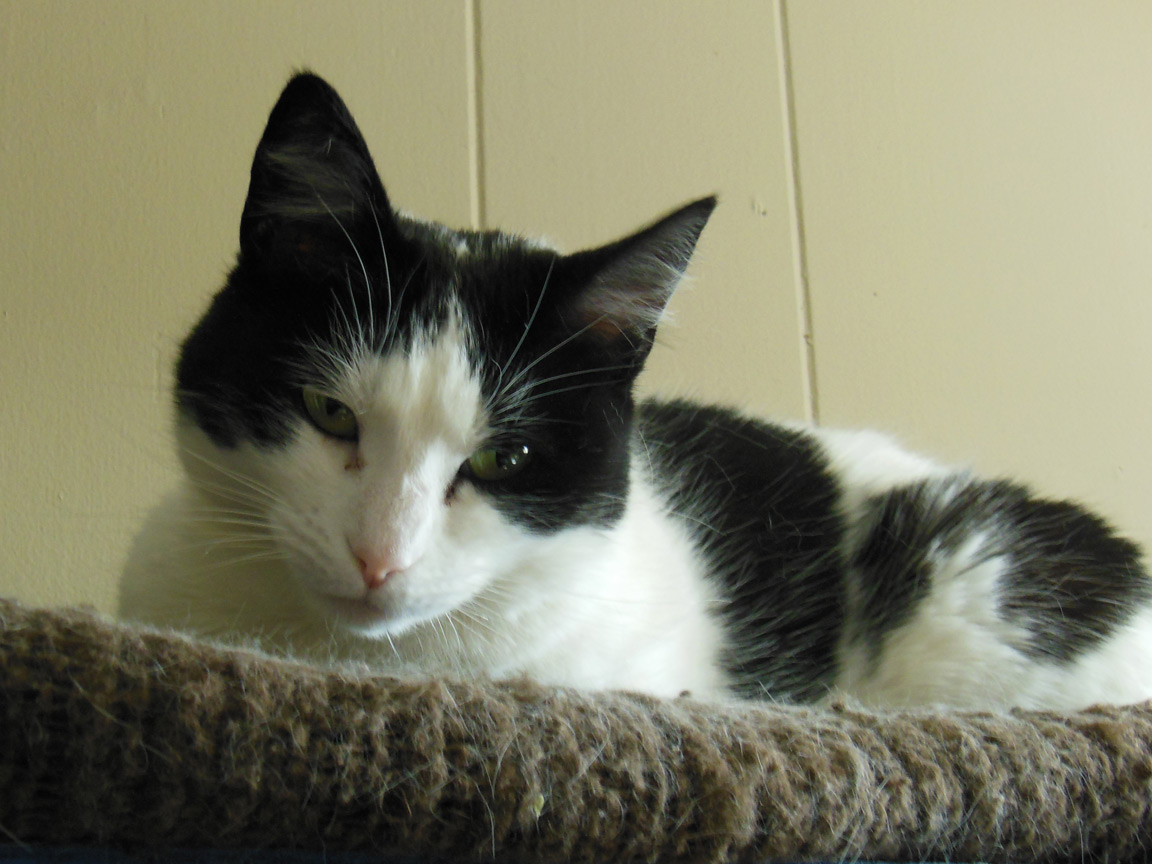 CLEO age 9, was adopted from the Clifton shelter in 2012, and it's uncertain whether she was born on the streets or lost/abandoned. She is docile and handlable, extremely affectionate and will sit in a lap. She gets along with other cats, but tends to be partial to males. She is also quite happy by herself and would do fine as an only cat. She love to climb to high spots and will sit on your shoulder!