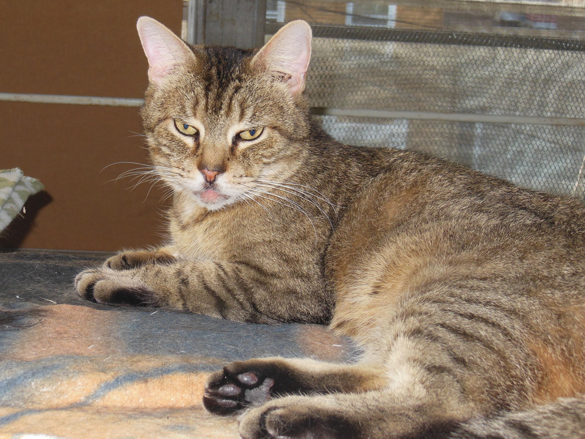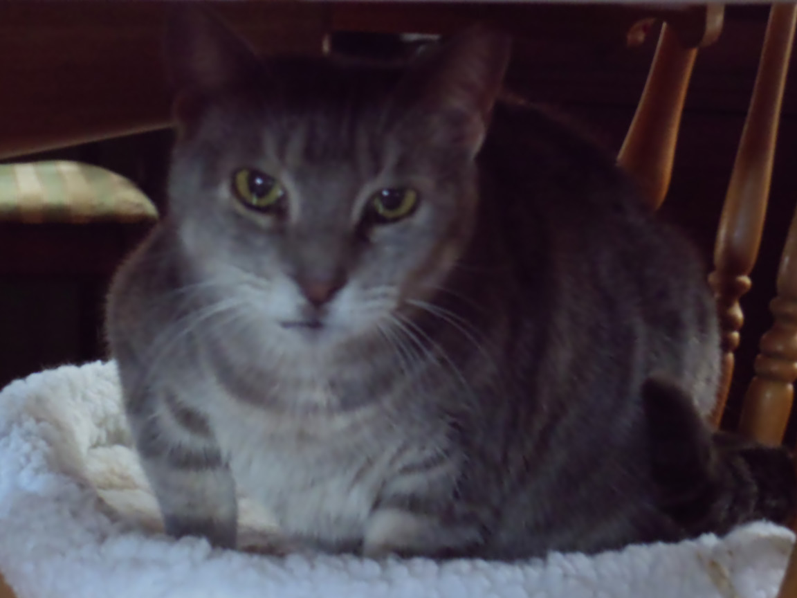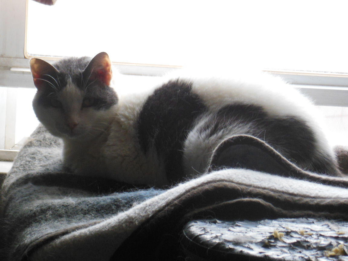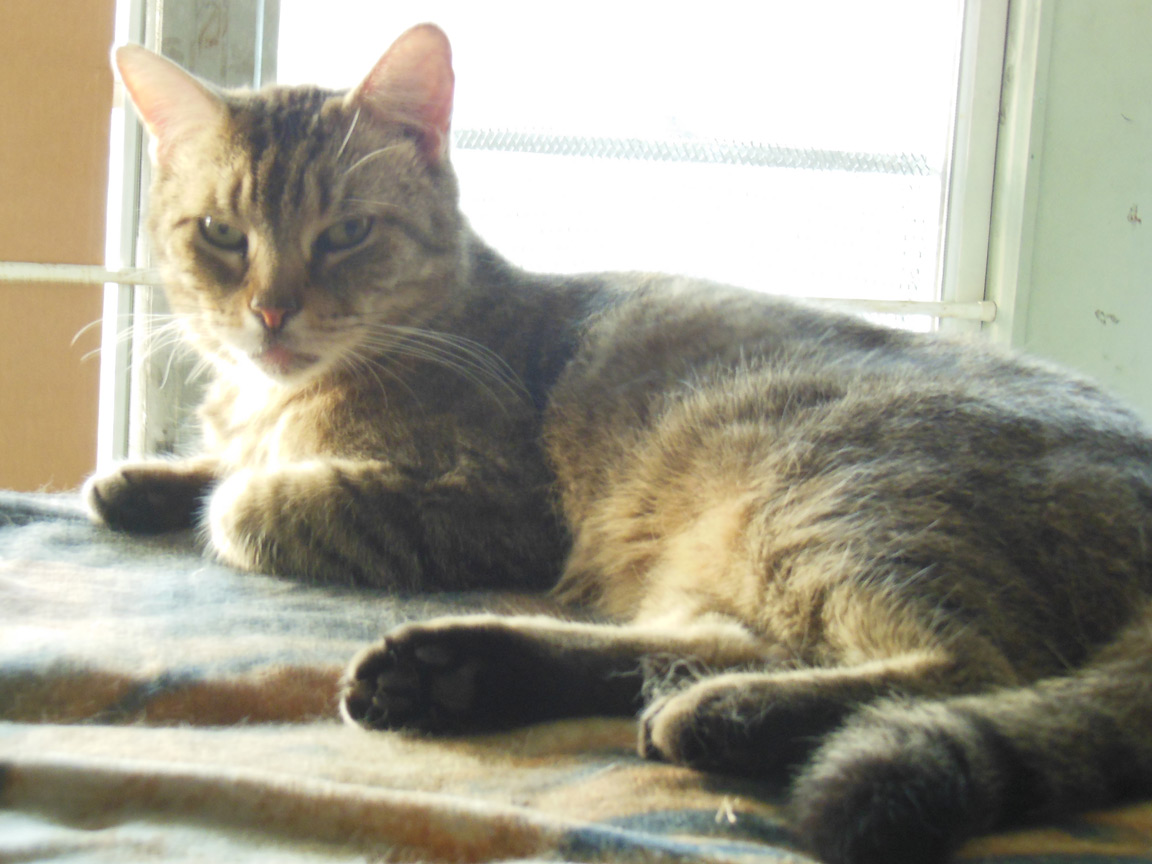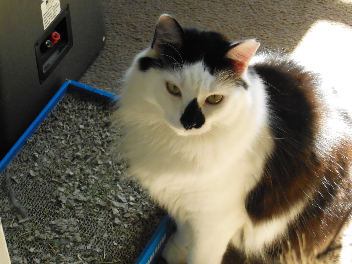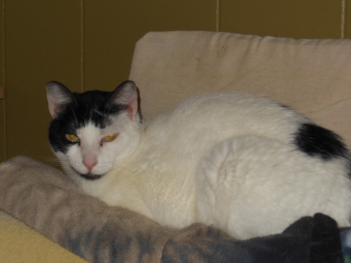 CLEO age 9, was adopted from the Clifton shelter in 2012, and it's uncertain whether she was born on the streets or lost/abandoned. She is docile and handlable, extremely affectionate and will sit in a lap. She gets along with other cats, but tends to be partial to males. She is also quite happy by herself and would do fine as an only cat. She love to climb to high spots and will sit on your shoulder!