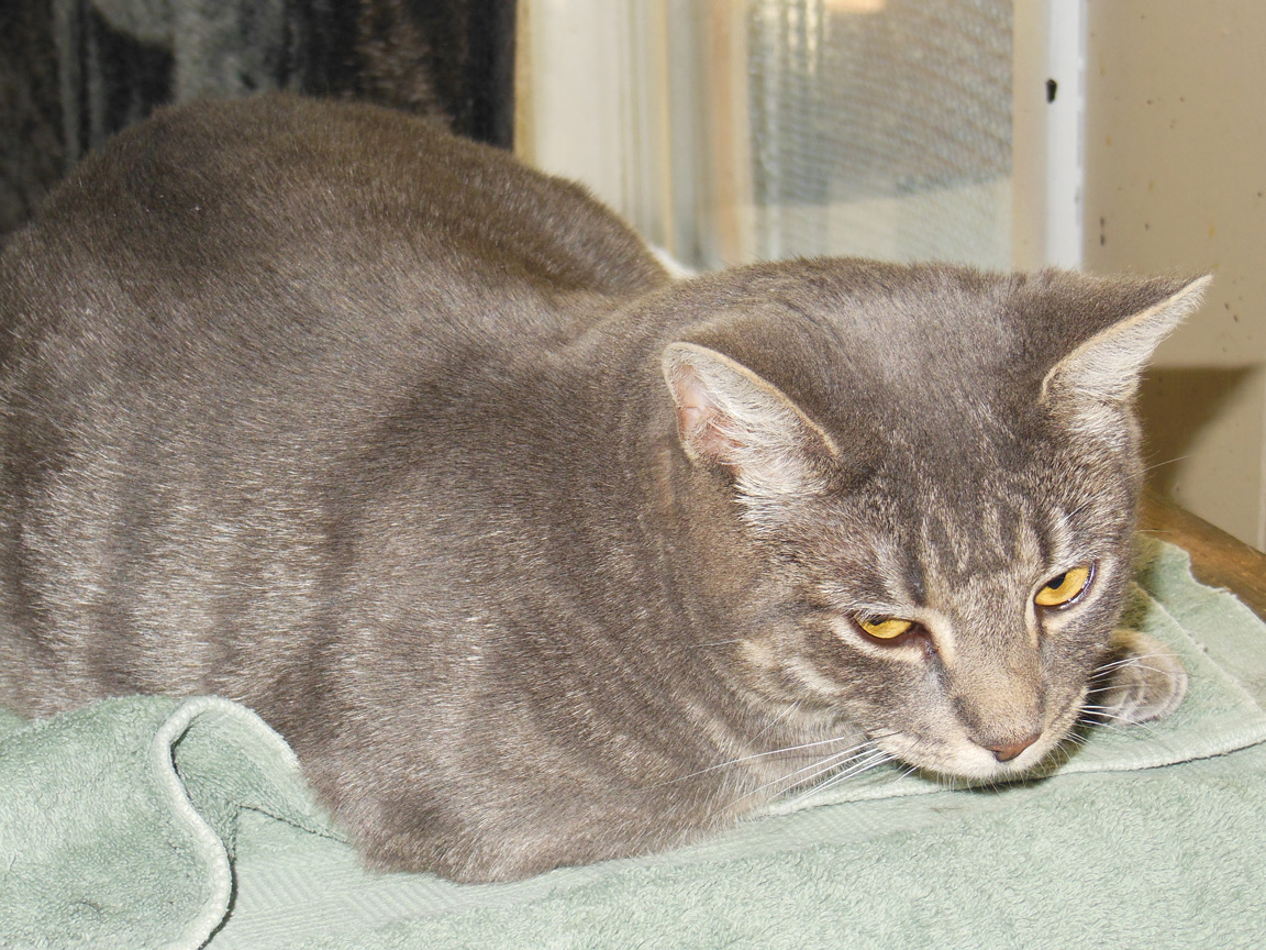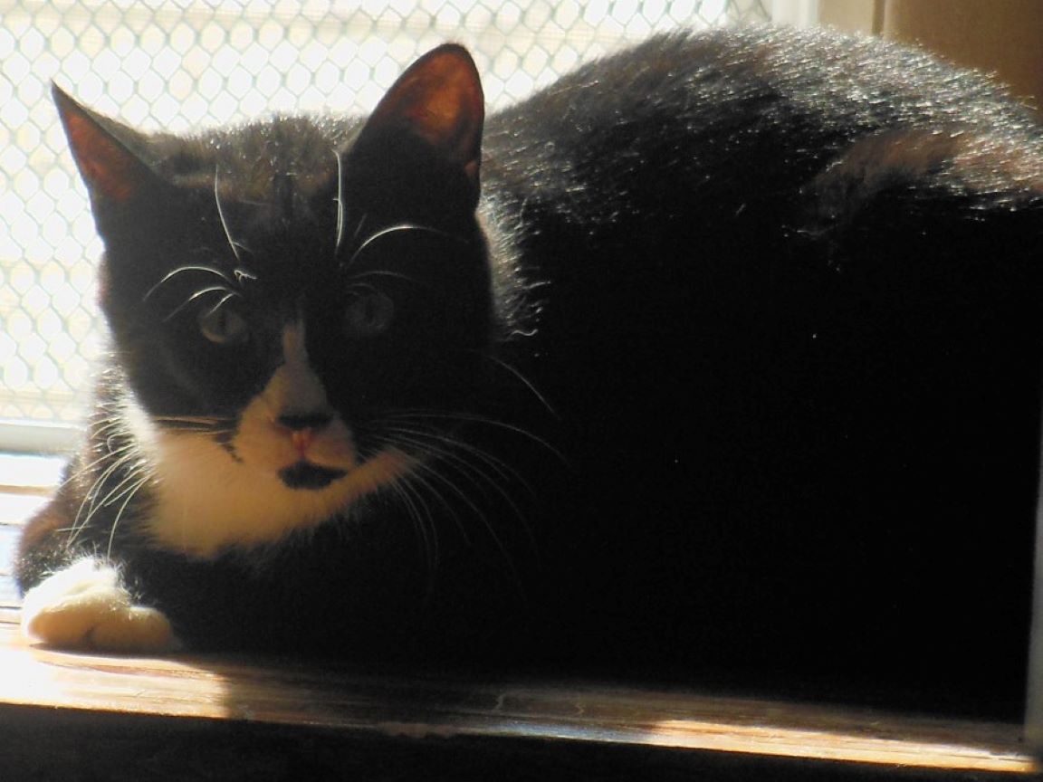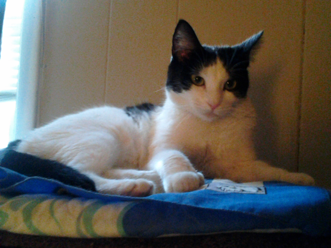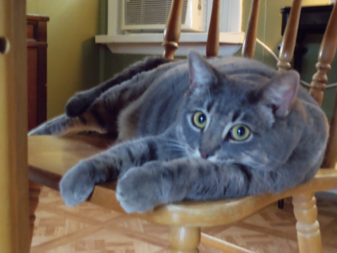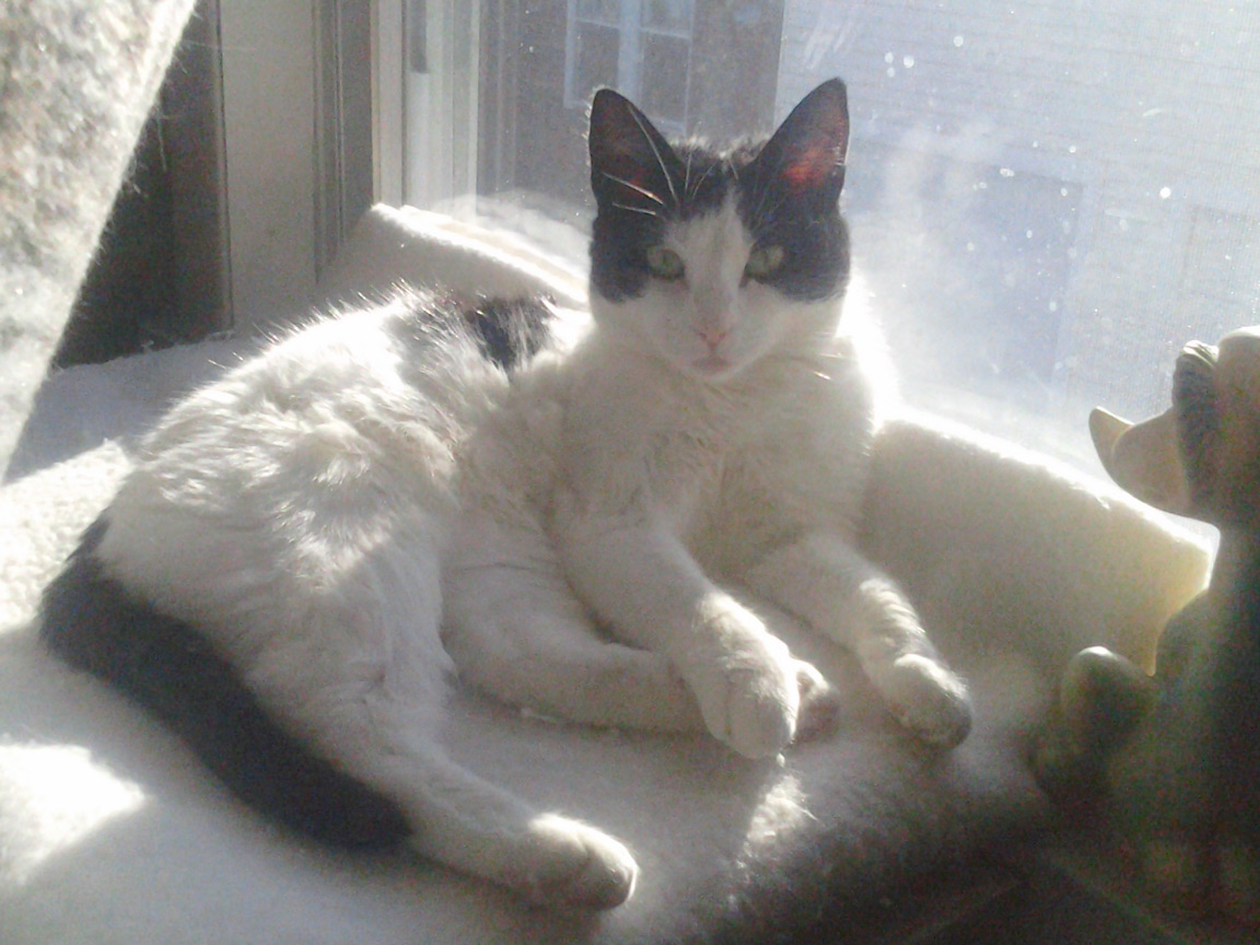 CLEO age 9, was adopted from the Clifton shelter in 2012, and it's uncertain whether she was born on the streets or lost/abandoned. She is docile and handlable, extremely affectionate and will sit in a lap. She gets along with other cats, but tends to be partial to males. She is also quite happy by herself and would do fine as an only cat. She love to climb to high spots and will sit on your shoulder!