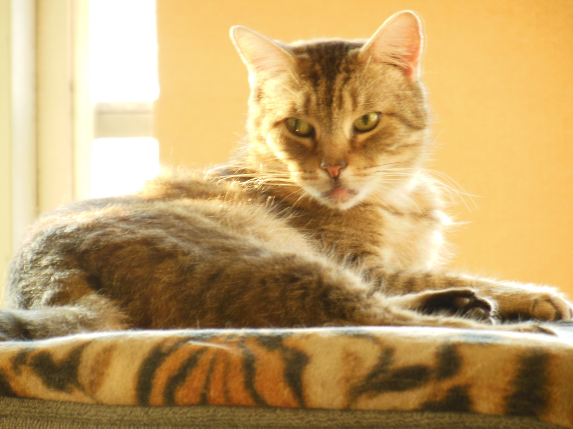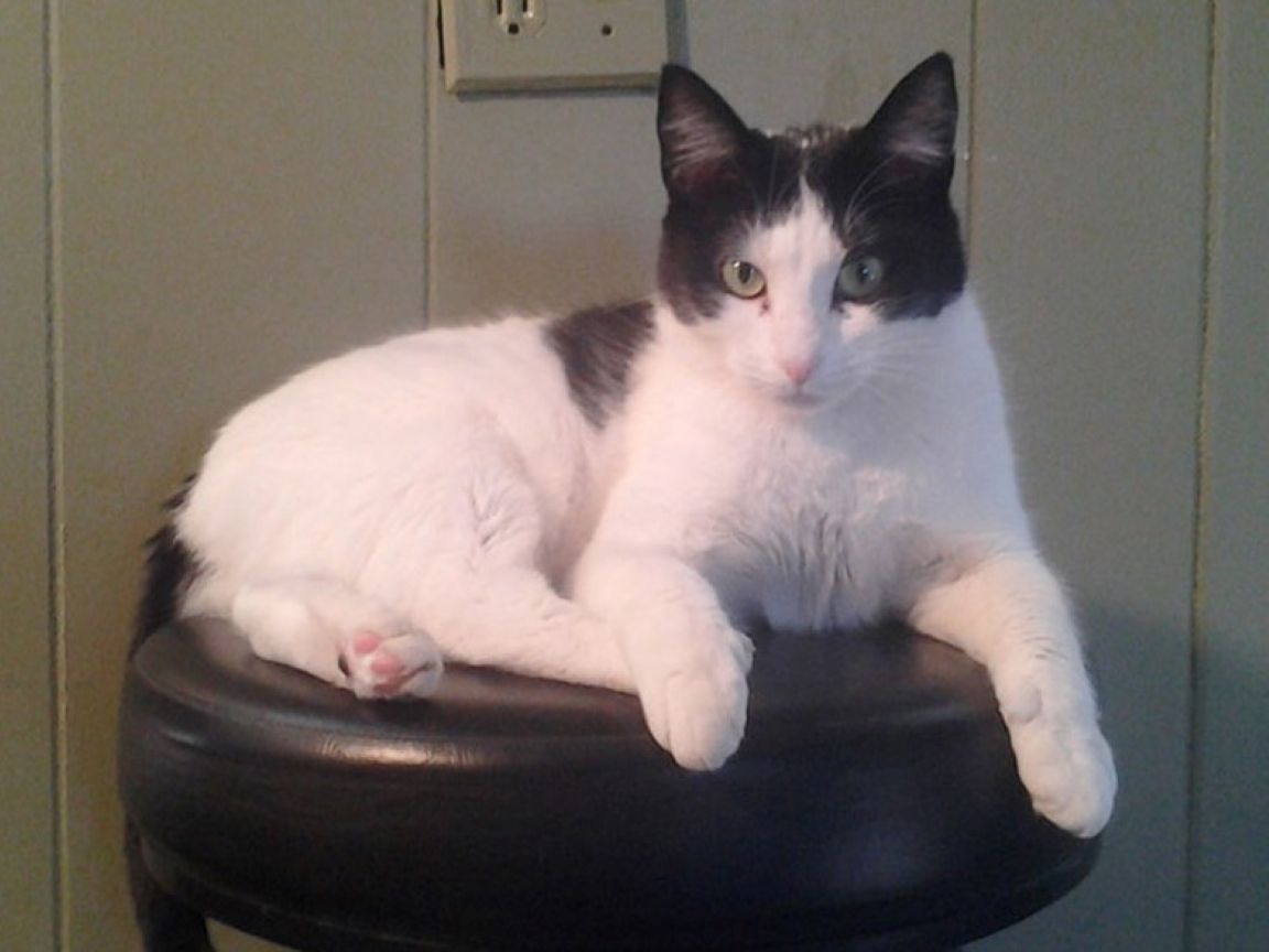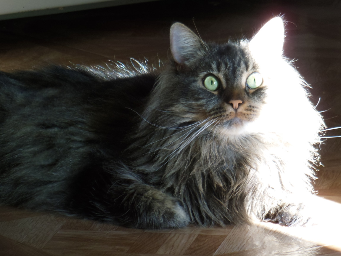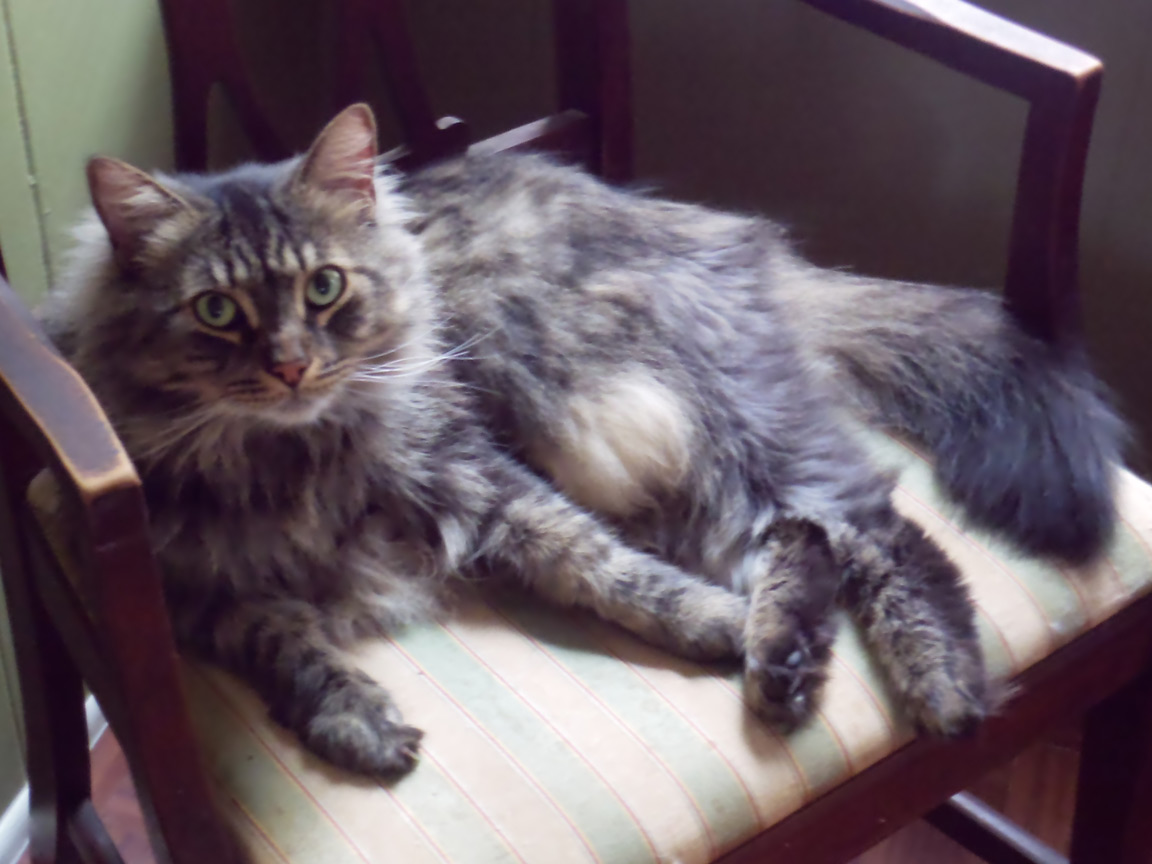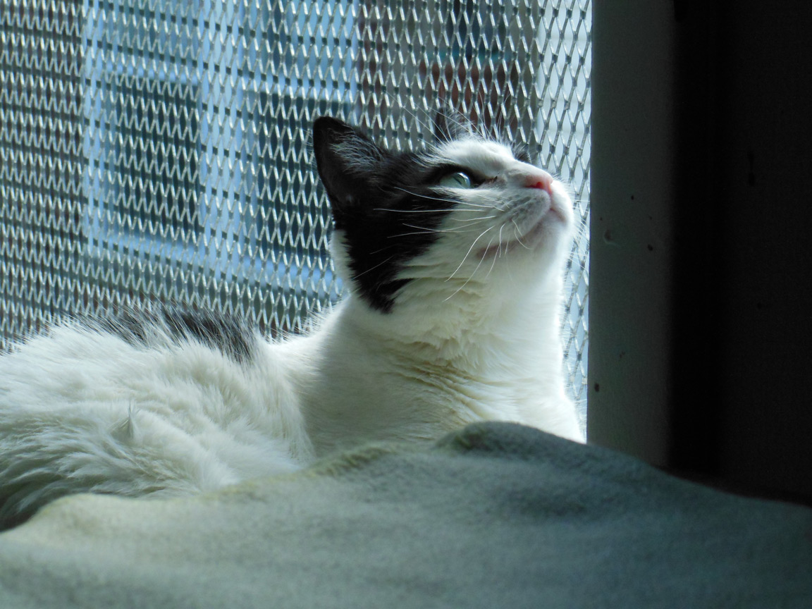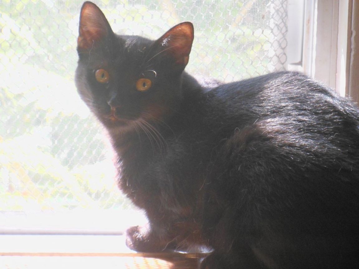 CLEO age 9, was adopted from the Clifton shelter in 2012, and it's uncertain whether she was born on the streets or lost/abandoned. She is docile and handlable, extremely affectionate and will sit in a lap. She gets along with other cats, but tends to be partial to males. She is also quite happy by herself and would do fine as an only cat. She love to climb to high spots and will sit on your shoulder!