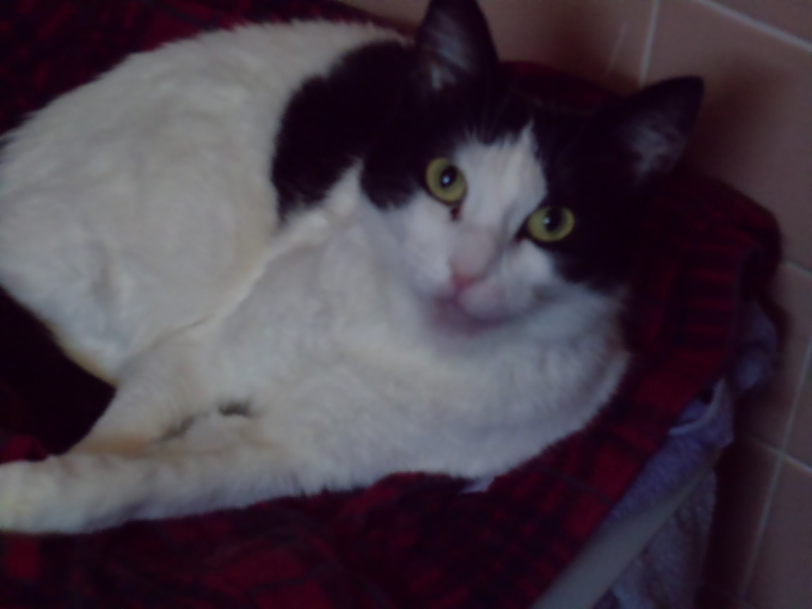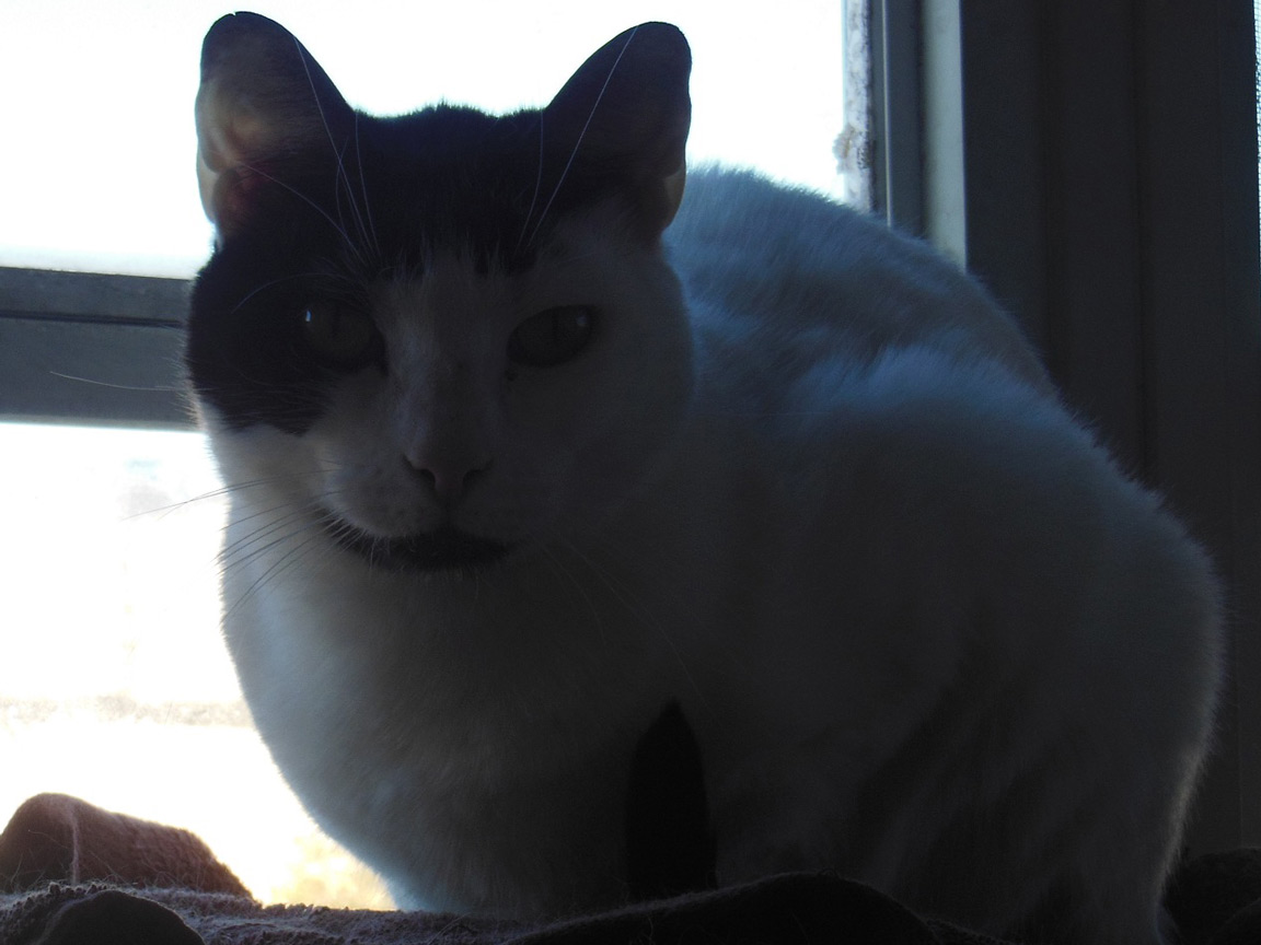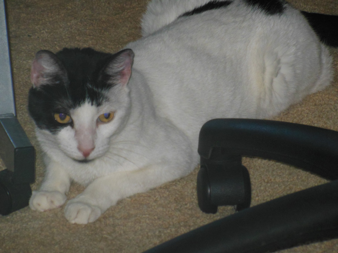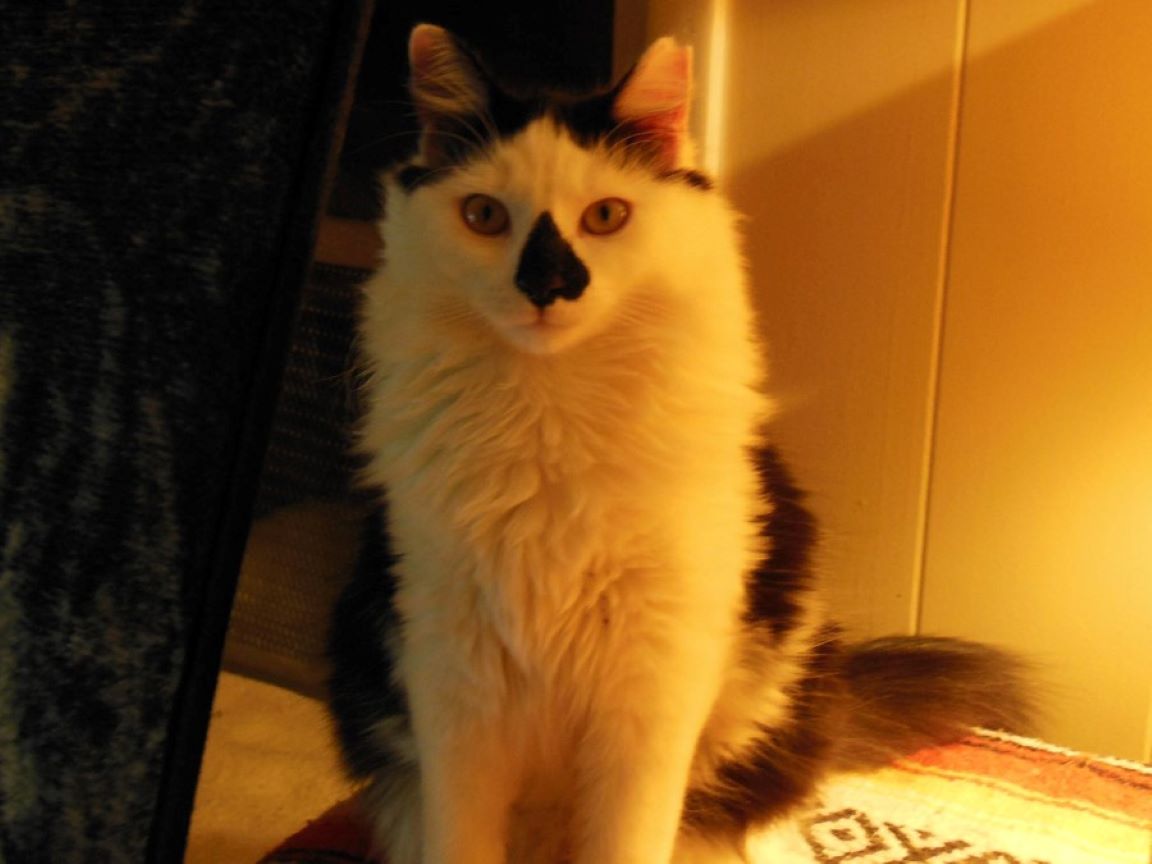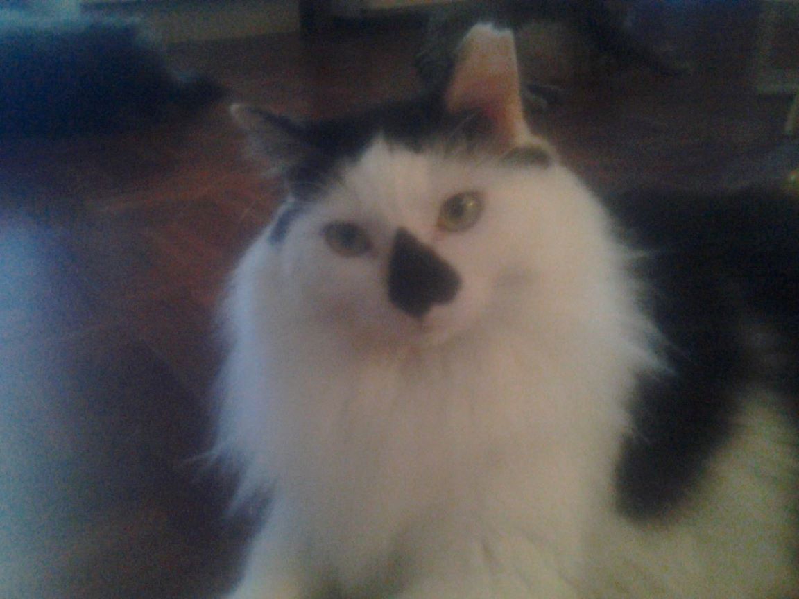 Cleo is small, has short white hair with black patches, and long ears. A very easy cat, and would be good for someone with little or no experience, as she was Vin's first cat. SHE MUST REMAIN AN INDOOR CAT!