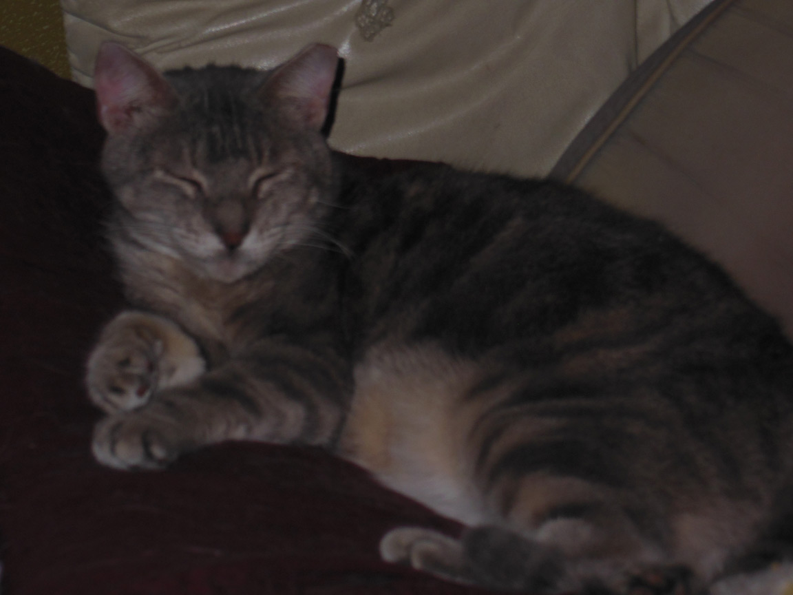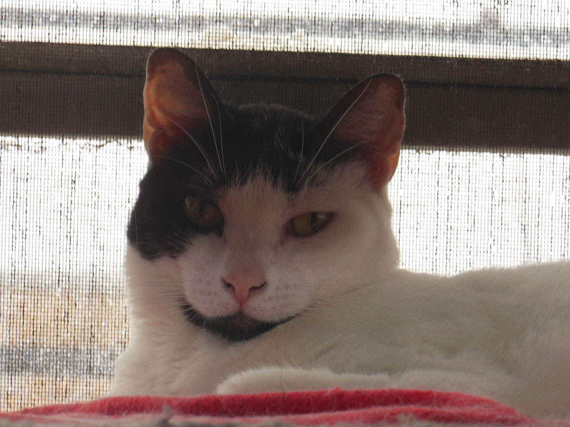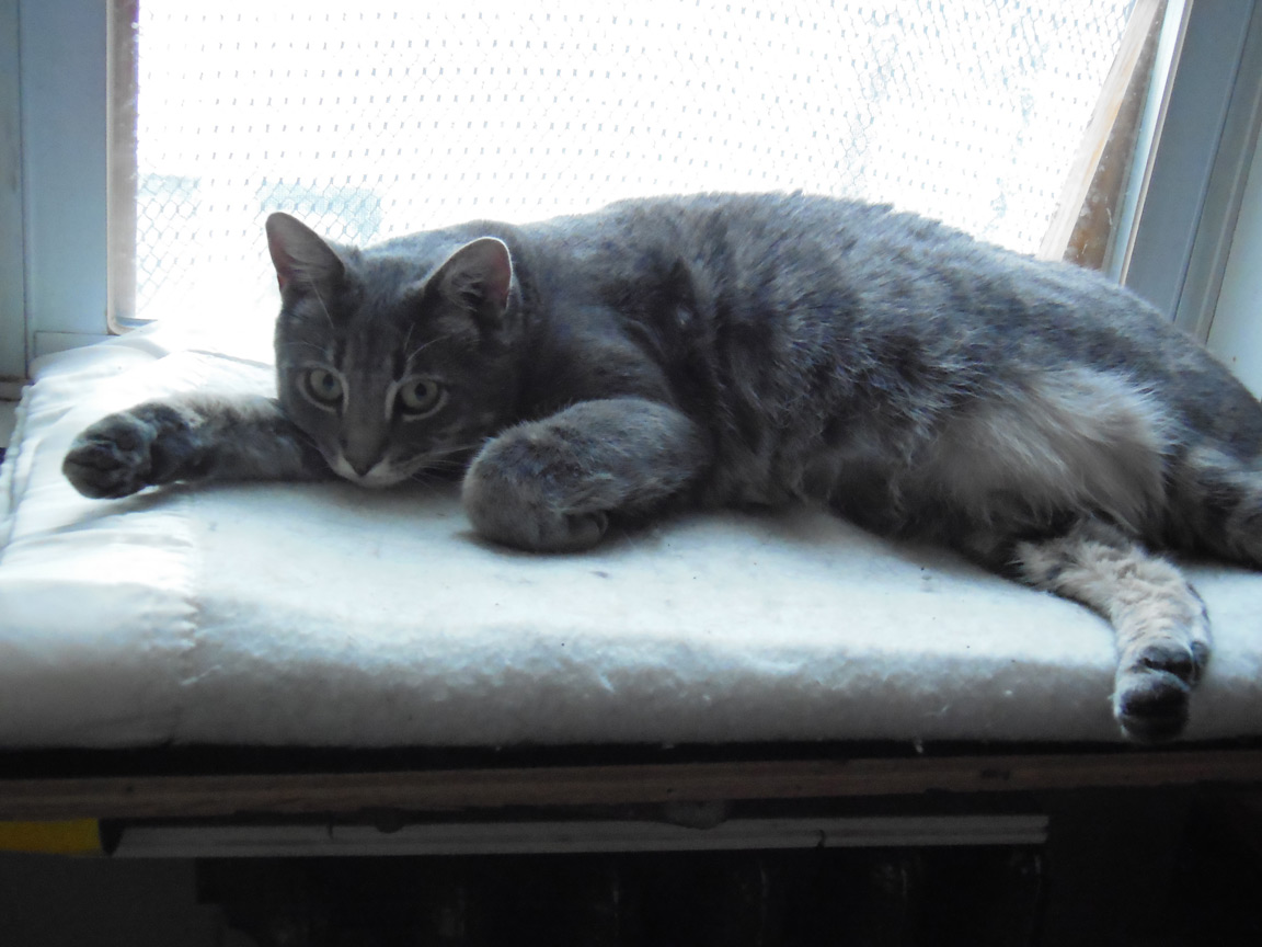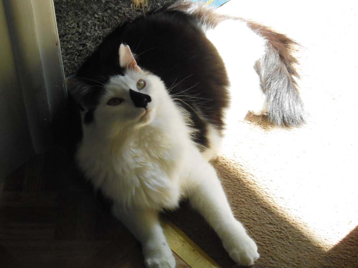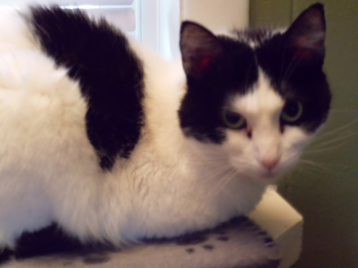 CLEO age 9, was adopted from the Clifton shelter in 2012, and it's uncertain whether she was born on the streets or lost/abandoned. She is docile and handlable, extremely affectionate and will sit in a lap. She gets along with other cats, but tends to be partial to males. She is also quite happy by herself and would do fine as an only cat. She love to climb to high spots and will sit on your shoulder!