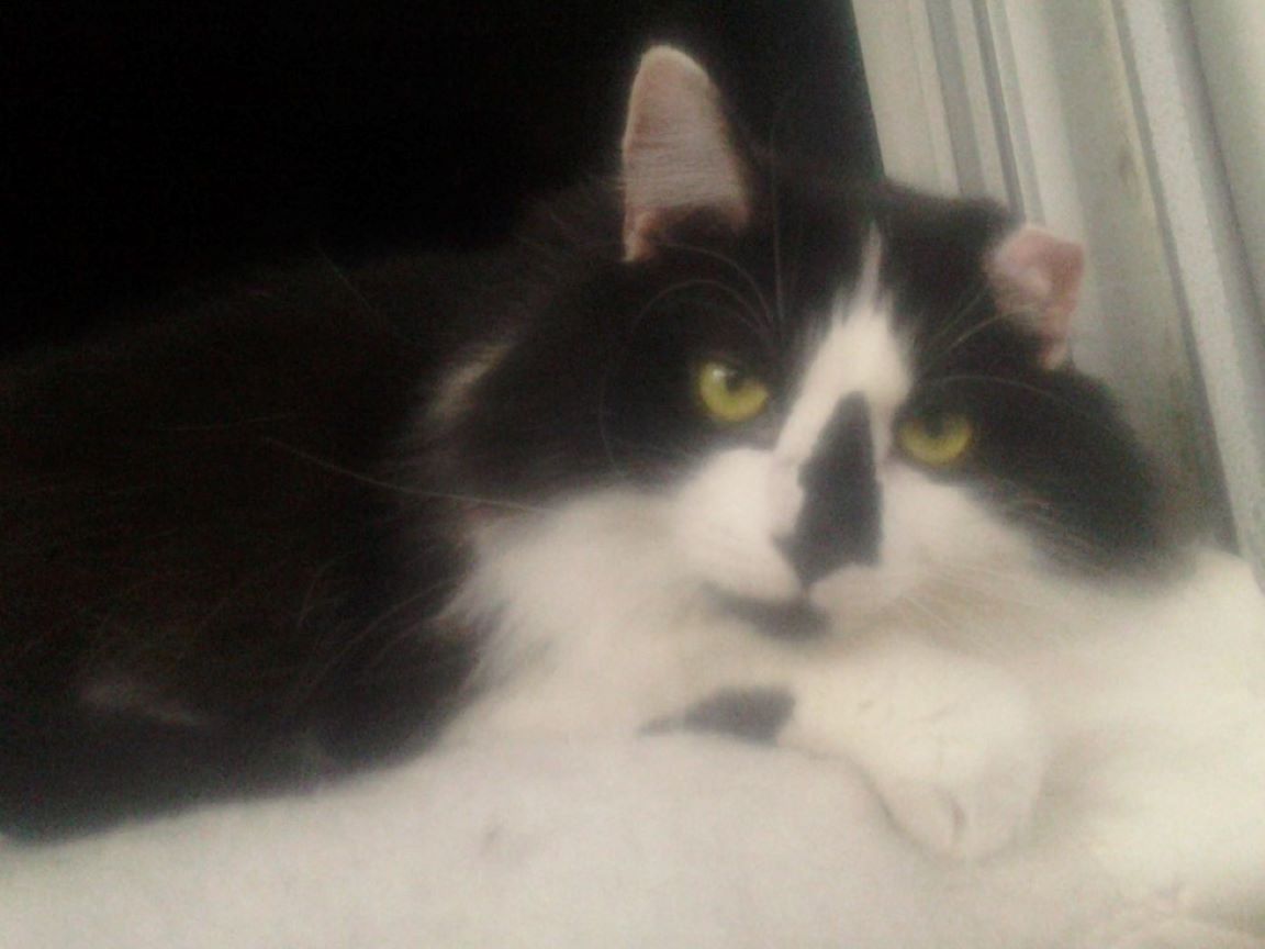 Cleo is small, has short white hair with black patches, and long ears. A very easy cat, and would be good for someone with little or no experience, as she was Vin's first cat. SHE MUST REMAIN AN INDOOR CAT!